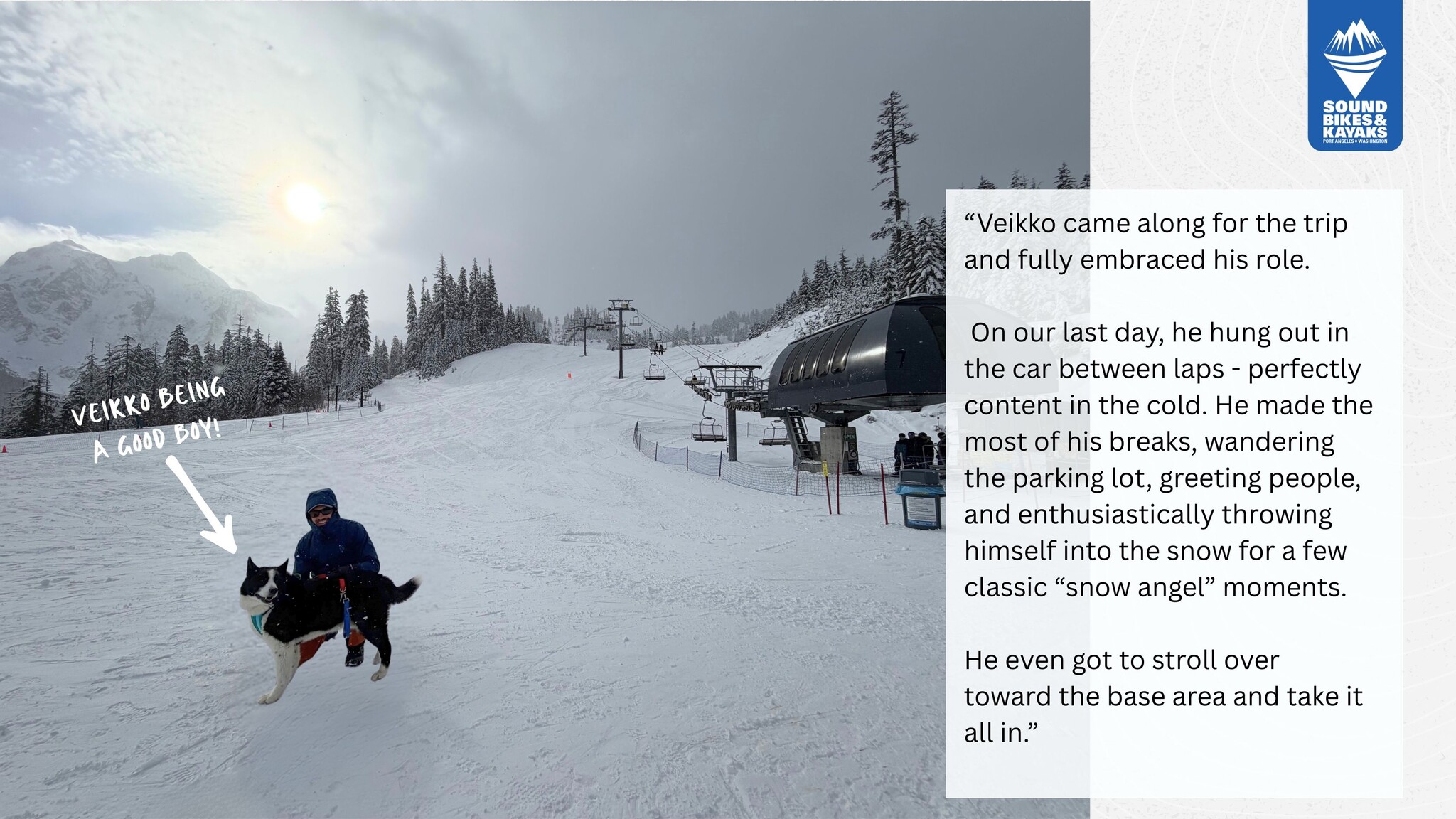 On our last day, he hung out in the car between laps - perfectly content in the cold. He made the most of his breaks, wandering the parking lot, greeting people, and enthusiastically throwing himself into the snow for a few classic “snow angel” moments. He even got to stroll over toward the base area and take it all in.